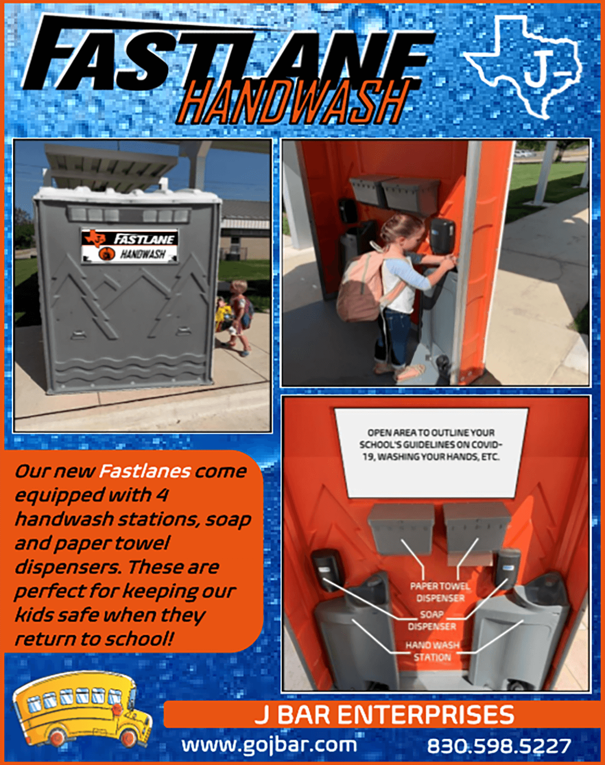 Our job at J Bar is to assist in that important development by working in conjunction with Central Texas schools in providing a sanitized environment for students, parents, and staff members. Our goal is to ensure they can arrive at school and return home to their families with peace of mind, knowing they were able to spend their day as safe as possible from the spread of Covid-19.